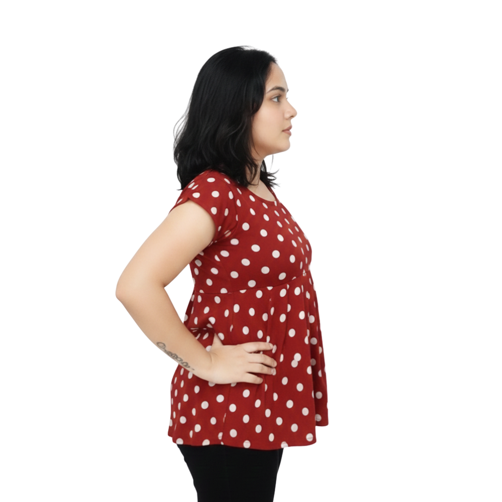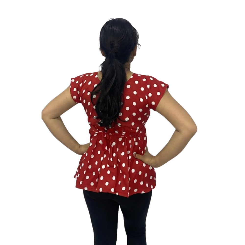 Full Description: Add a dash of retro charm to your look with this stylish Polka Dot Top. Crafted from lightweight and breathable fabric, this top features a round neckline and short sleeves. The highlight of this piece is the self-tie ribbon at the back, allowing you to adjust the fit to your liking, creating a beautiful hourglass silhouette from behind. The flared hem adds a feminine touch, making it versatile enough to style with skinny jeans, jeggings, or trousers.